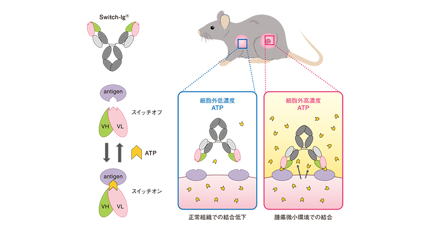 ③Switch-Ig:病態組織において特異的に抗原と結合できる抗体を創製するための技術。抗体医薬の標的となる抗原は正常組織でもある程度発現していることがあり、抗体を投与した際に病態組織以外の正常な組織でも作用し、毒性が生じる事があります。本技術により、抗体の病態組織選択性を高めることができます。例えば、腫瘍微小環境で高濃度に存在するATP(アデノシン三リン酸)が存在する時に結合能が強くなる抗体では、腫瘍選択性を高めることができます。この技術を用いることでより安全性の高い治療用抗体を提供できることを期待しています。